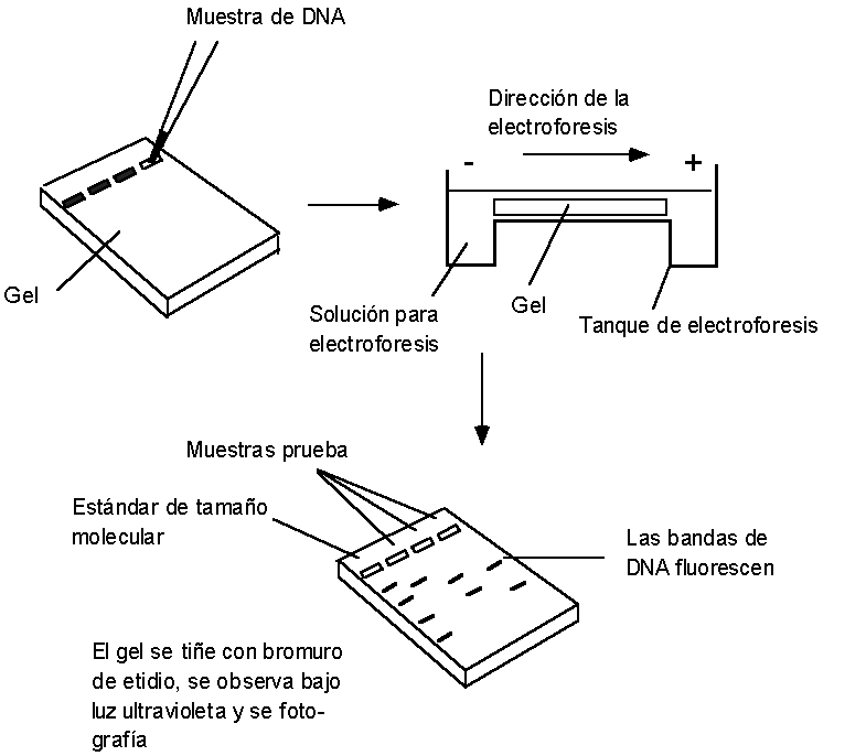 El gel se prepara dentro de un molde con agarosa y queda ni más ni menos que como una gelatina (ver la Fig. 2). Si dejamos algunos huecos en la parte superior del gel (pozos) los podemos llenar con el ADN que queremos observar. Aquí es donde hablamos de ELECTROFORESIS. El gel de agarosa está sumergido en una solución de sales (ésta permite conducir electricidad) dentro de una caja con un electrodo a cada extremo. Aplicamos un voltaje de manera tal que en el extremo del gel en donde está el ADN quede una carga negativa y al otro extremo quede positiva; el ADN, que tiene una carga negativa se moverá a través del gel hacia la carga positiva. Las moléculas más pequeñas podrán sortear más fácilmente los obstáculos del gel (imagínate una esponja) y avanzarán más rápidamente. El resultado final es que las moléculas de ADN se separan por tamaño (los de adelante (moléculas más pequeñas) corren mucho y los de atrás se quedarán (moléculas más grandes), trás, trás ). Este gel ahora se sumerge en una solución de un compuesto fluorescente llamado bromuro de etidio, el cual se intercala al ADN y nos permitirá verlo si utilizamos luz ultravioleta. Podemos ahora fotografiar este gel y utilizar la fotografía para analizar los resultados. Si usamos fragmentos de ADN de tamaño conocido como estándar, podremos estudiar y determinar el tamaño de las moléculas por comparación con el estándar.