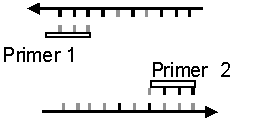 La clave de este método está en la enzima ADN polimerasa. Esta es una enzima que puede utilizar una cadena de ADN para polimerizar una cadena complementaria a ésta. Sin embargo, esta enzima no puede empezar de cero. Necesita un pequeño segmento de ADN que esté ya unido al ADN que va a copiar, esto es, necesita un primer. Bien, si tengo un fragmento de ADN de doble cadena y dos primers distintos y cada uno complementario a una de las cadenas del ADN molde, puedo hacer que cada uno de los primers sea el iniciador de la replicación de su cadena molde, como se muestra a continuación: