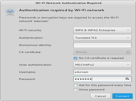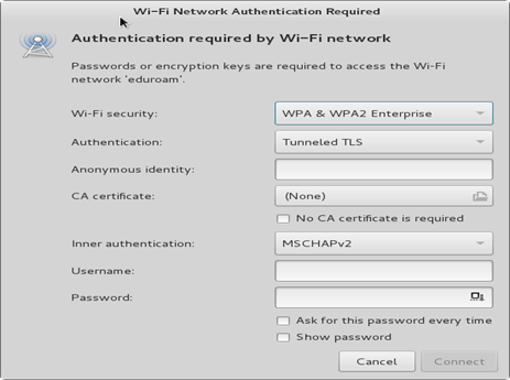 2.- Al momento de hacer clic en la red eduroam se nos despliega una ventana como la siguiente, dependiendo de la distribución de Linux puede cambiar un poco la apariencia.
